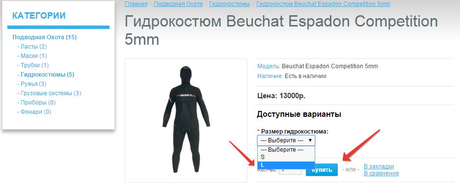 2. Выберите подходящий гидрокостюм и размер, выпадающем списке.