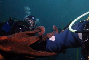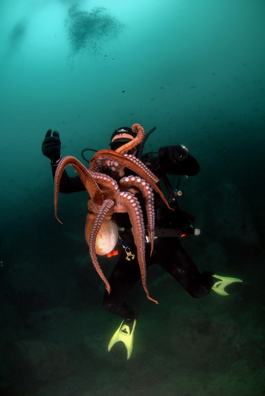 Как только осьминог ощутит свое превосходство и поймет, что перед ним слабый соперник, он осмелеет и вылезет из норы, чтобы устрашить вас своими размерами. Таким образом решаются квартирные вопросы: проигравший убегает. Знакомство с осьминогами настолько увлекательное занятие, что надо не забывать поглядывать на манометр.
